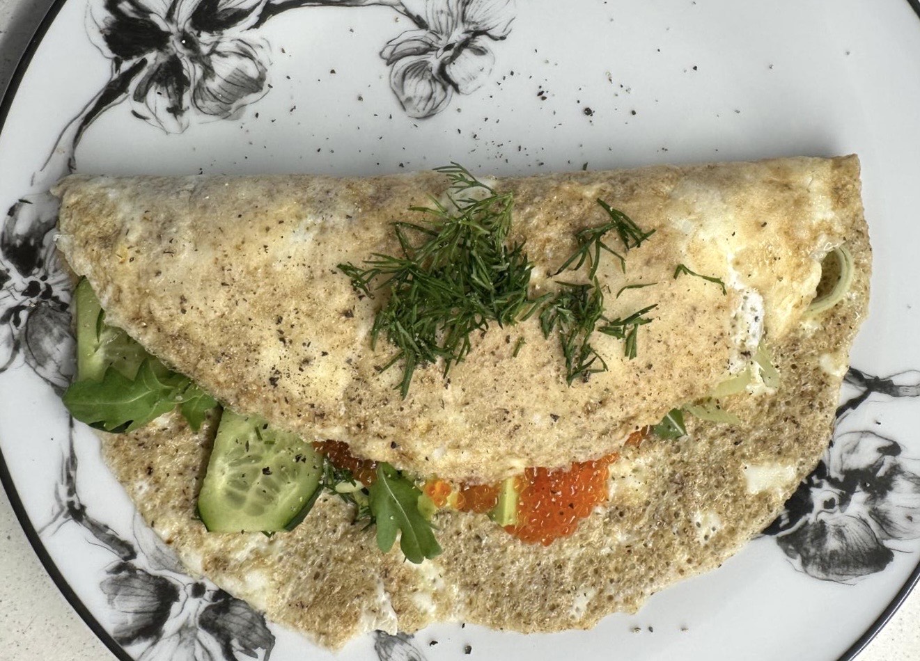 Kiaušinių baltymų blynas su avokadu ir sūdyta lašiša (be glitimo)
