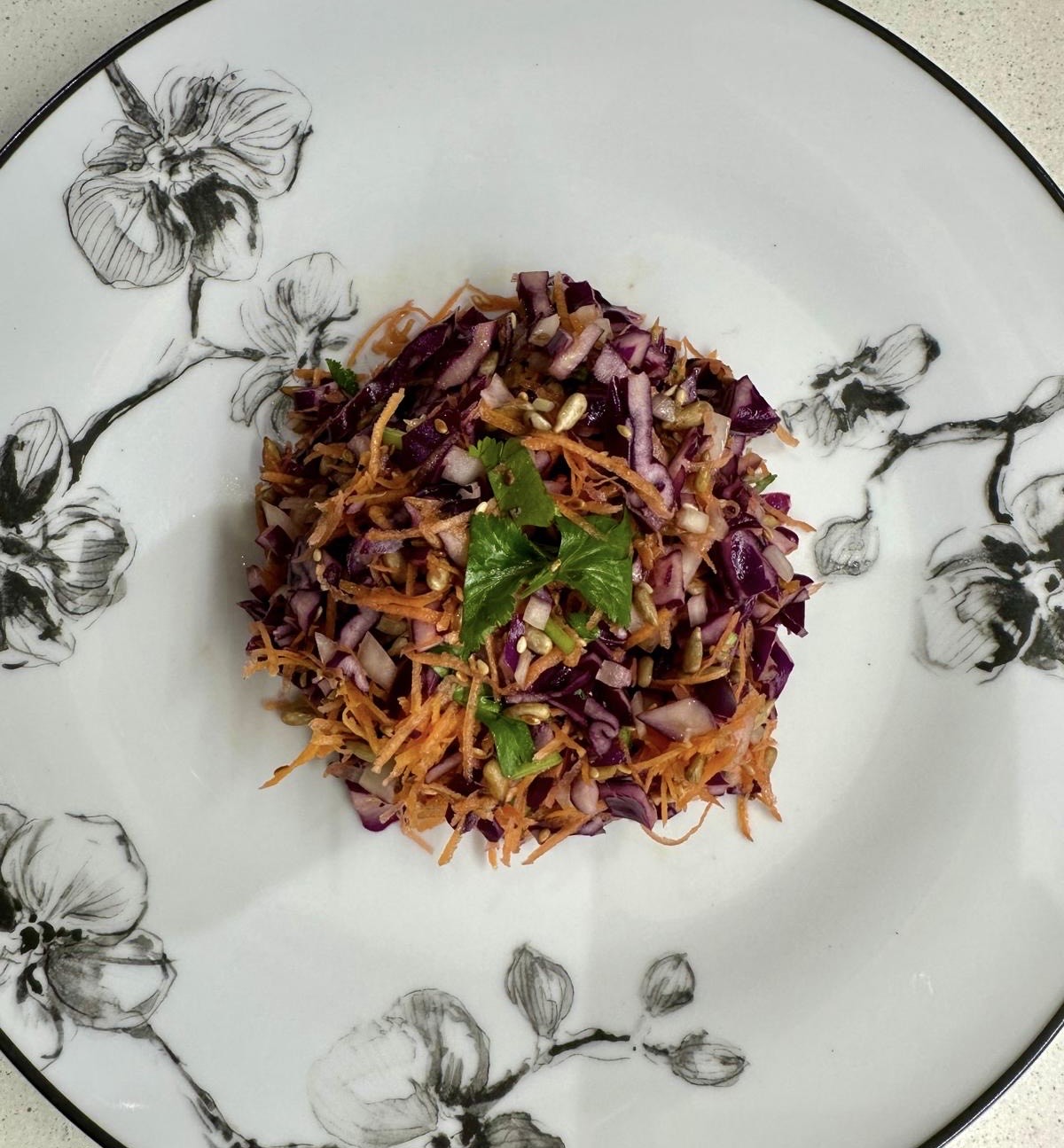 Mėlynojo kopūsto salotos su kalendra, saulėgrąžomis ir sezamu